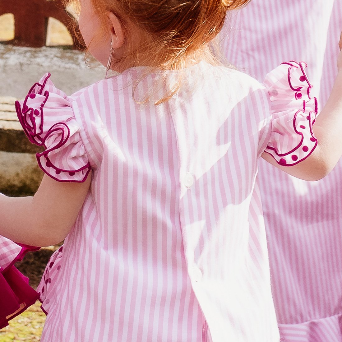 Celebra sus primeras ferias con nuestros trajes de flamenca bebé, una pieza única que combina el encanto del cuadro vichy en rosa y blanco con lunares flocados en fucsia. Un traje de flamenca para bebé lleno de personalidad, con manga a la sisa, escote en pico y volantes asimétricos pensados para su total libertad de movimiento. Incluye braguita cubrepañal a juego.