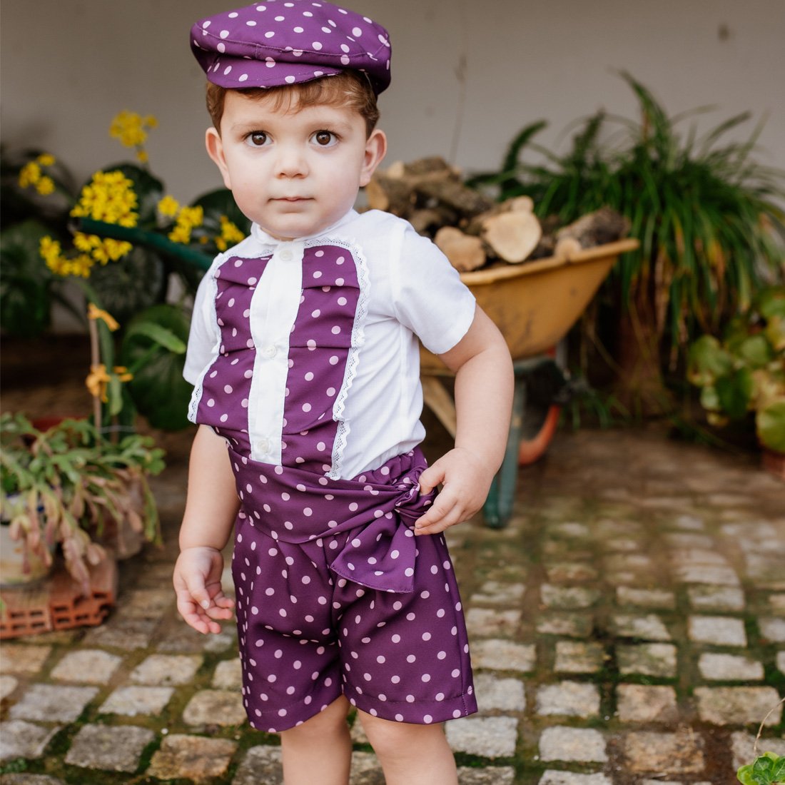 Viste a tu pequeño con la nuestra tradición de la mano de Carmen Garrido. Este conjunto flamenco niño de tres piezas (camisa, pantalón y fajín) es perfecto tanto para bebés como para niños desde los 3 meses hasta los 6 años. Su camisa blanca de cuello mao, con detalles de encaje, combina a la perfección con el pantalón burdeos de lunares rosas.