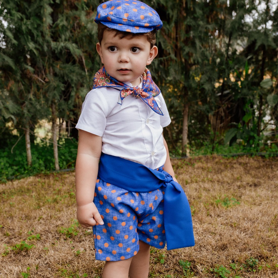 Nuestro Gaditano, un traje flamenco infantil compuesto por pantalón, camisa, fajín y pañuelo flamenco. La camisa blanca de manga corta tiene botones delanteros y cuello mao, mientras que el pantalón azul con lunares naranja está confeccionado en tejido Stretch con cintura elástica ajustable. El pañuelo estampado de cachemir combina con el pantalón y el fajín azul liso completa el look. Y si quieres, te damos la opción de añadir gorra flamenca infantil a juego en el mismo tejido.