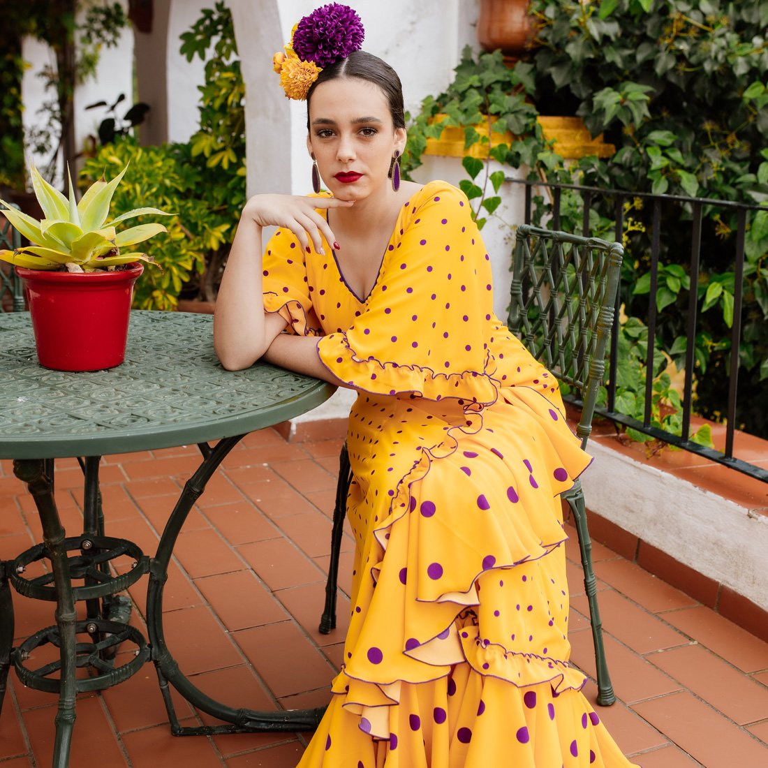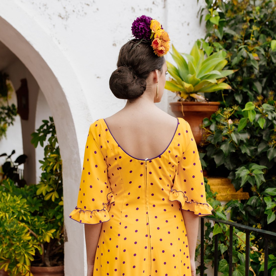 El contraste de lunares morados sobre fondo amarillo define una de las batas rocieras más alegres de la temporada. Incluye mangas de capa, escote en pico ajustable y opción de mantoncillo bordado con flecos artesanales.