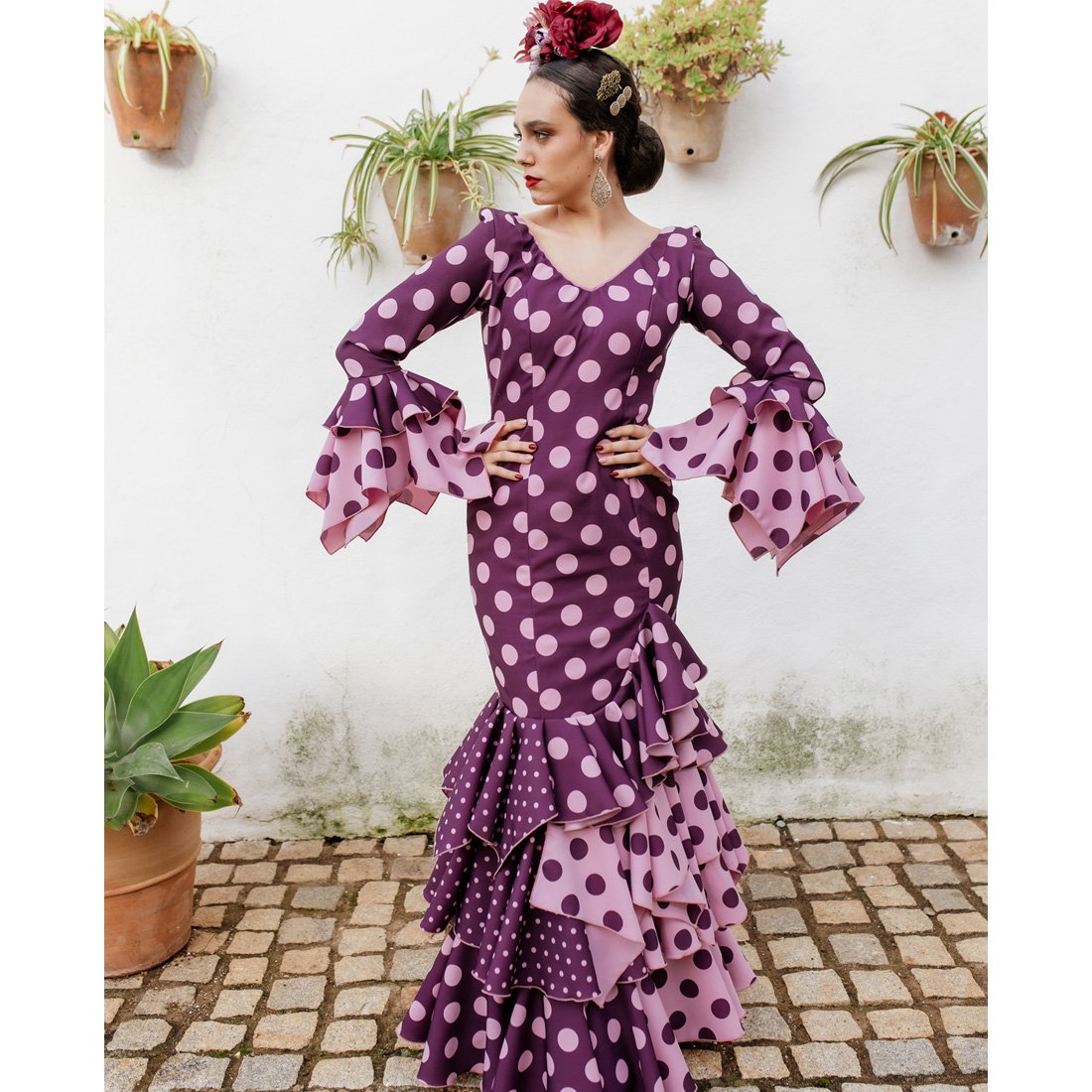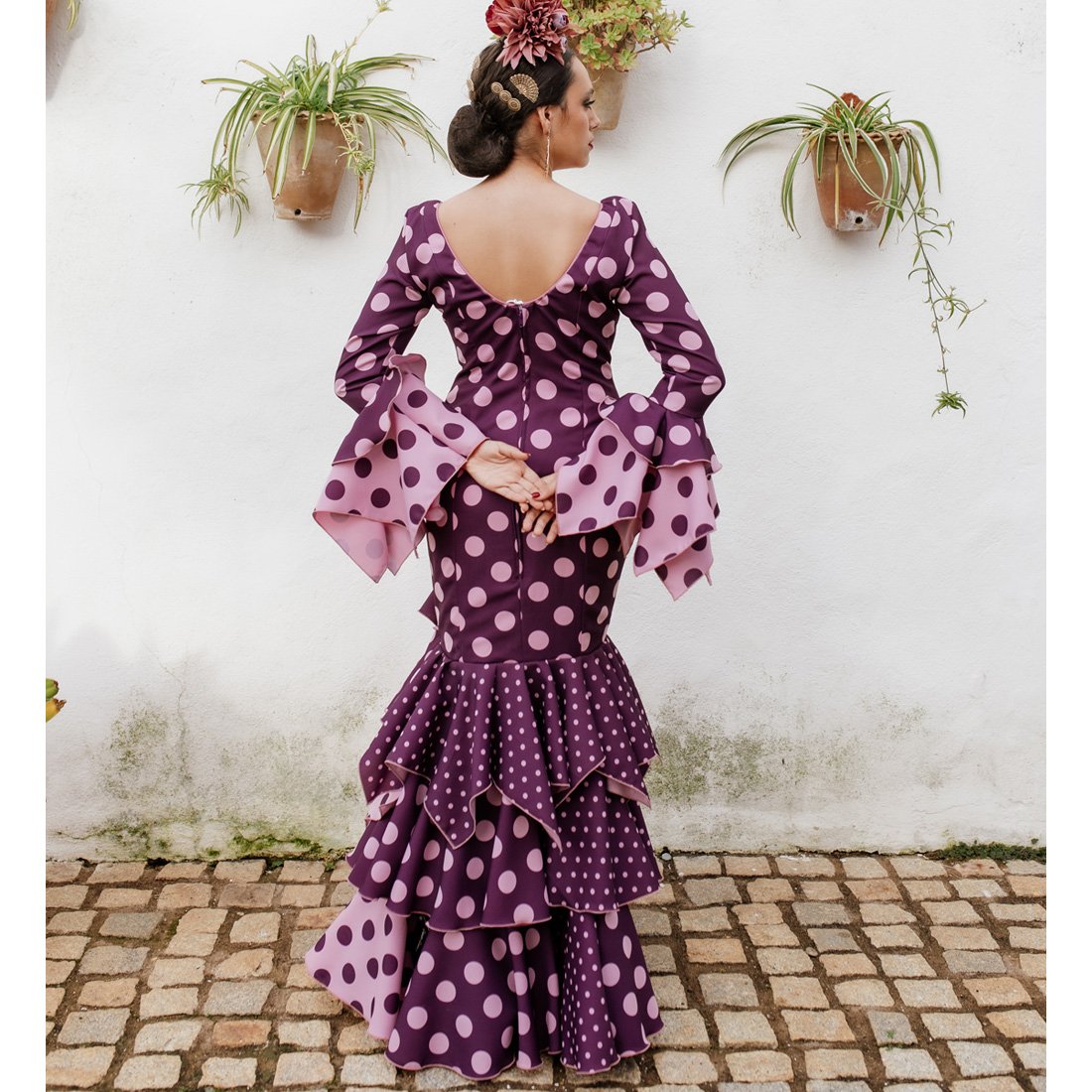 Este vestido flamenco para mujer de corte entallado hasta la rodilla, escote de pico y manga larga, realza la silueta femenina de forma natural. Confeccionado en tejido stretch y con una combinación de tonos burdeos y rosa con lunares de distintos tamaños. Tanto la falda como las mangas presentan volantes de capa redondos y volantes de picos, creando un efecto lleno de arte. Incluye cremallera trasera y cordoncillo regulable en el escote para un ajuste perfecto y favorecedor.